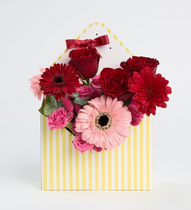 Sarı Çizgili Kutuda Kırmızı Gül Pembe Çardak Gül ve Gerbaralar